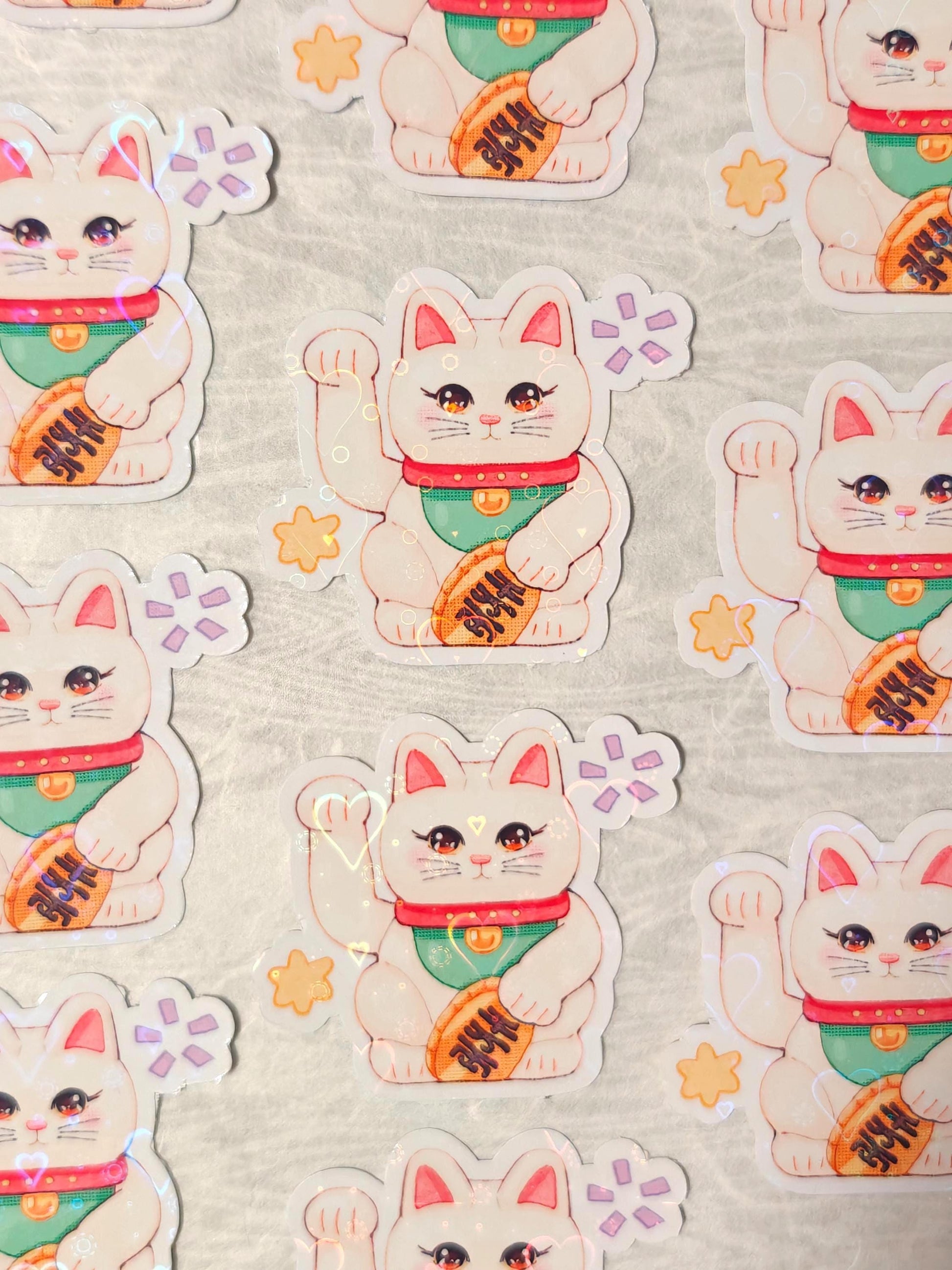 This is a glossy vinyl die-cut holographic paper sticker, illustrated and made in-house by me. It's waterproof and ideal for decorating hard surfaces like laptops, water bottles, and phone cases, adding a cute touch to your belongings.