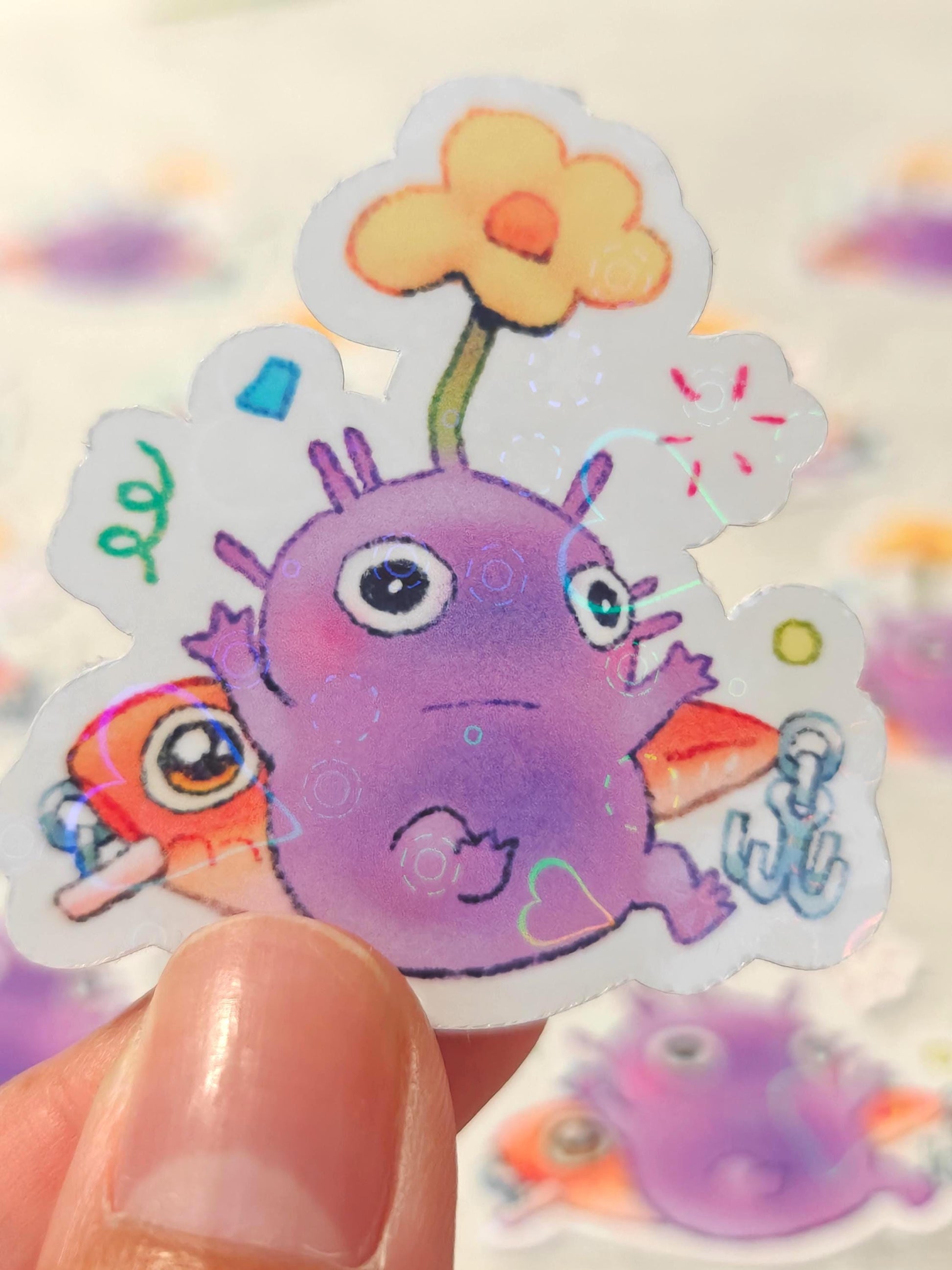 This is a glossy vinyl die-cut holographi paper sticker, illustrated and made in-house by me. It's waterproof and ideal for decorating hard surfaces like laptops, water bottles, and phone cases, adding a cute touch to your belongings.