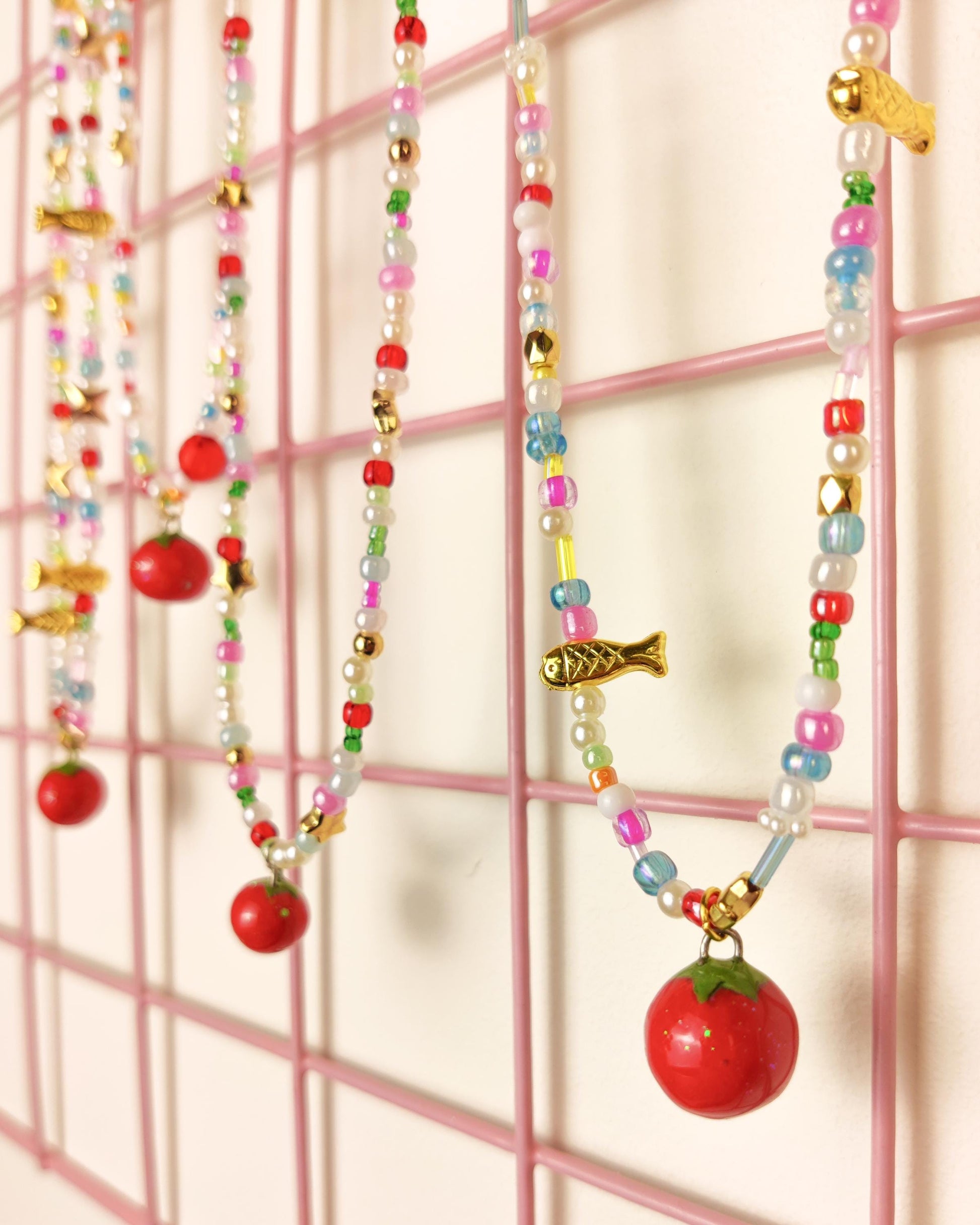 Each necklace is crafted with love and care, making every piece totally unique! The tomato charms are hand sculpted from polymer clay and are painted carefully with acrylic paint and resin to protect the charm. I hand bead each necklace with beautiful glass beads, ensuring no two are ever the same. Every tomato has its own charm, with different shapes and size.