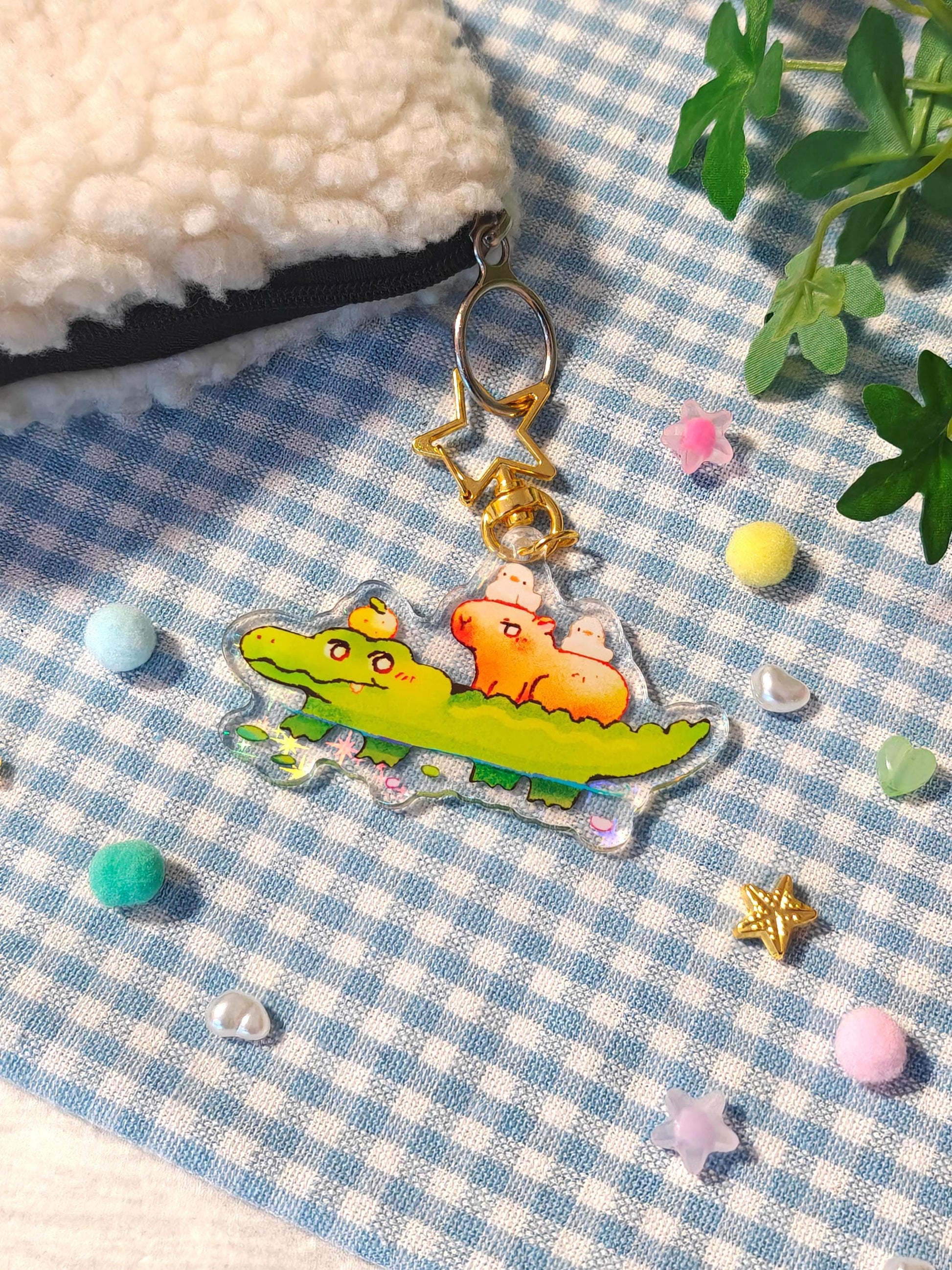 Add a splash of fun to your everyday essentials with this adorable double-sided star holographic crocodile, capybara and duck keychain! Featuring a star hook for easy attachment, it's the perfect accessory to jazz up your bags, keys, or any item that could use a little extra charm. A playful and functional addition to your collection! ✨