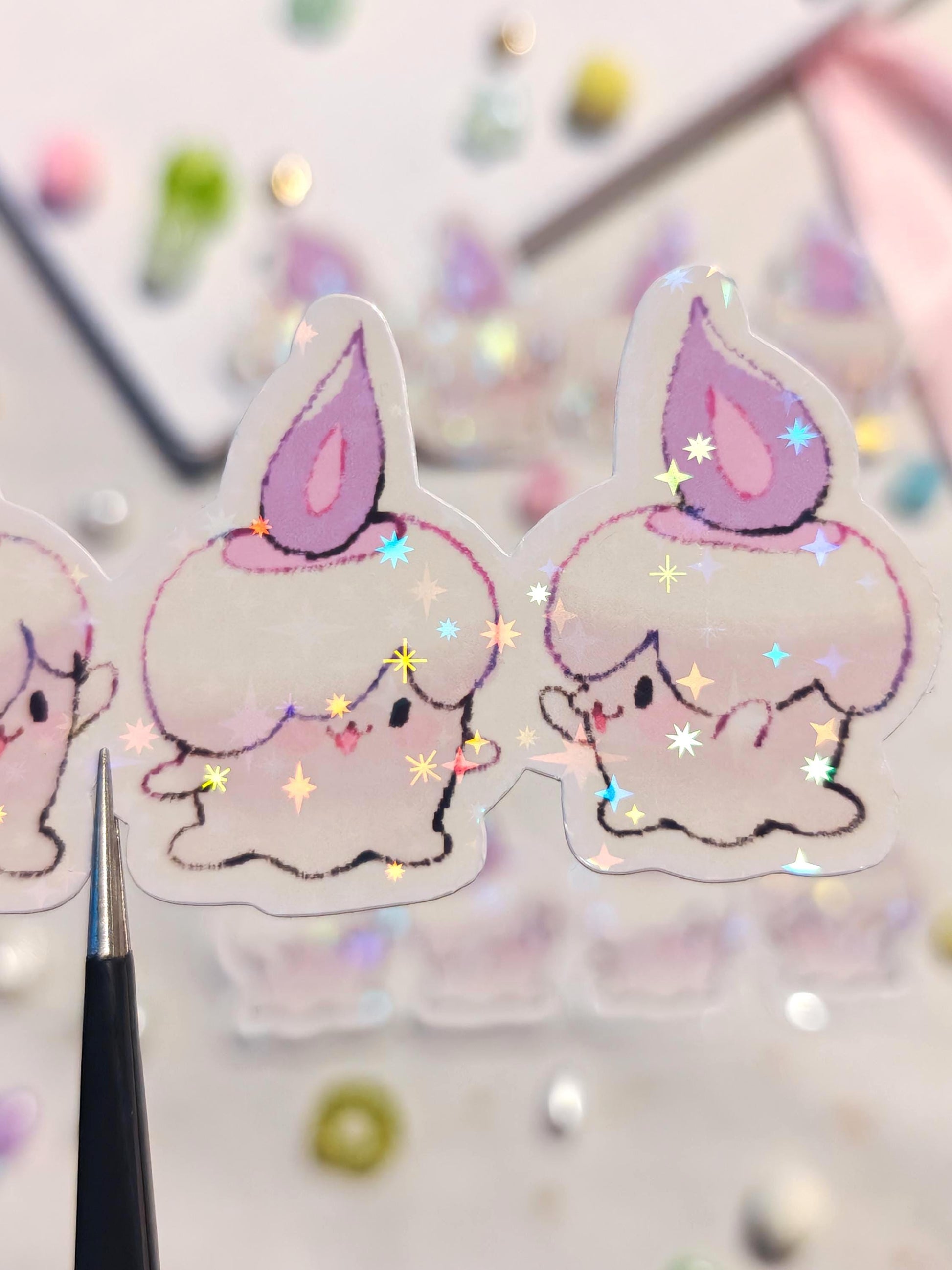 This is a glossy holographic vinyl die-cut paper sticker, illustrated and made in-house by me. It's waterproof and ideal for decorating hard surfaces like laptops, water bottles, and phone cases, adding a cute touch to your belongings.